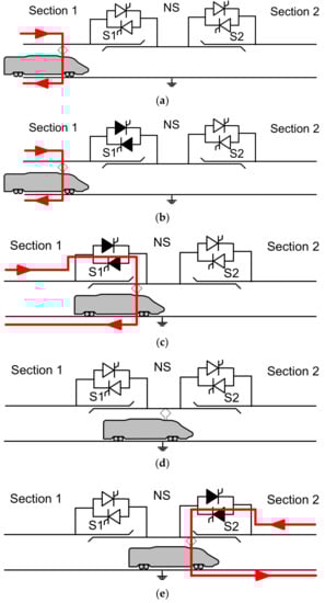 In states 3 and 5, the NS feeds from one section through one static switch, S1 or S2. The pantograph of the train is only in contact with the NS catenary and the train current is established through the NS and one static switch. Figure 3 shows the current flow in the different states of Table 1.