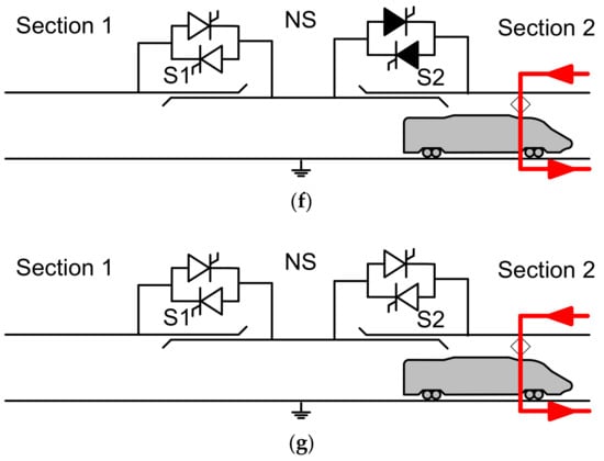 Current flow during transition states when a train runs through the neutral section from section 1 to section 2 in correspondence with Table 1. (a) State 1; (b) State 2; (c) State 3; (d) State 4; (e) State 5; (f) State 6; (g) State 7.
