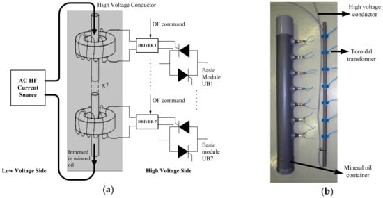 The power supply is based on current transformers at high frequency. An AC current source feeds a high-voltage conductor, which crosses the toroidal magnetic core, where a current is induced into secondary winding to feed each thyristor driver. Figure 5 shows the topology to feed seven thyristor drivers, half of one stack of seven basic modules. The AC HF current source includes an LLC resonant tank working at 25 KHz, which feeds the high-voltage conductor. This topology is suitable for working in an open loop and with variable loads such as thyristor drivers []. Seven toroidal transformers are crossed by the high-voltage conductor and immersed in mineral oil to guarantee the isolation requirement.