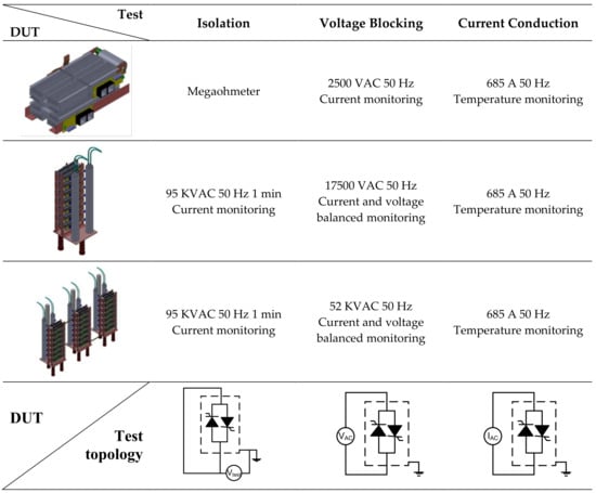 Based on [,], the purpose of the test is to validate the electric isolation, blocking voltage, and current conduction capabilities of the AC static switch. The process starts with the test of thyristor basic modules, then thyristor stacks, and finally AC static switch, and the test sequence is as follows: isolation, voltage blocking, and current conduction. Figure 6 shows the functionality tests.