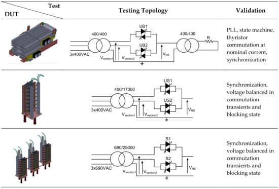 The procedure sequence, Figure 7, starts with the test of the basic module; two phases of low-voltage transformer are used like voltages of sections 1 and 2, and the third phase is the rail connected to the ground. A second one-phase transformer is connected to the basic modules and ground, and this configuration emulates the train travelling into the NS. The one-phase transformer has a resistor load equivalent to the nominal current absorbed by the train. In these conditions, the PLL and state machine of the control system are validated and the commutation transitions at nominal current through the thyristors are verified. Also validated is the synchronization of the on- and off-switching of the thyristor with the voltage phase to reduce the transformer inrush current and guarantee the thyristor blocking at zero current.