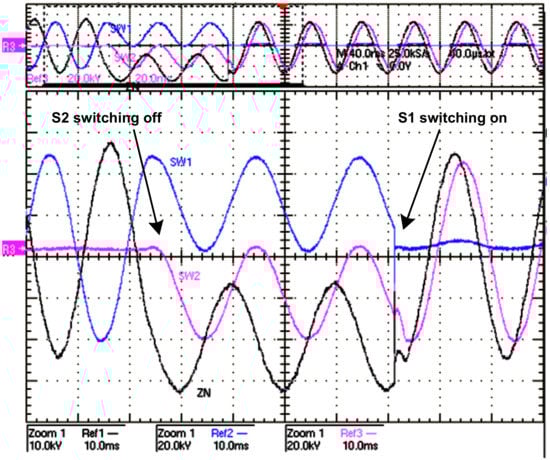 Switching transient between AC static switches S1 and S2 at 30 KV without load obtained in laboratory tests. SW1, S1 voltage; SW2, S2 voltage; ZN, NS voltage.