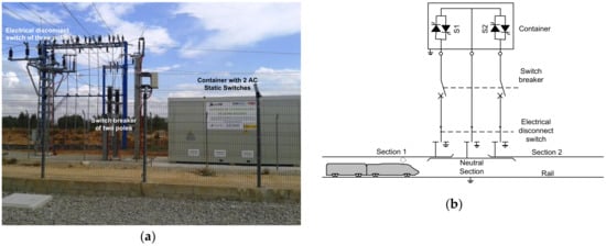 According to the problems identified above, a compensation strategies review and some power converter solutions were shown in [], which can reduce the impact on the main grid and eliminate the neutral section. These solutions [,,,,,,], based on very high-power converters, come with considerable cost. Engineers of the Japanese National Railways Tokaido Shinkansen HSR installed two switch breakers to feed NSs from the adjacent catenaries. For commutation assurance between catenary voltages and to avoid short circuit, 0.3 s without voltage in an NS are required [,]. The circuit breakers must work for each train crossing the NS. Therefore, on the Tokaido Shinkansen, they must be replaced every five years. The Central Japan Railway Company [] proposed the use of static switches based on thyristors in NSs to replace the circuit breakers and reduce the inrush current on the transformer into the train. The study includes a demonstration of suppressing the inrush current on a transformer with a thyristor prototype at low voltage. Korea Railroad Research Institute [] proposed the use of static switches with thyristors and a sequence to trigger when the HST is running through the NS, but the on and off transition between static switches was not clear.