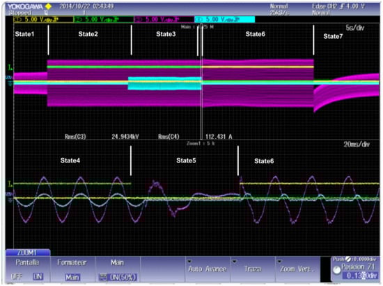 Figure 10 shows the complete electric sequence of the train crossing the NS with the states from 1 to 7 described in Table 1. The HST was near the NS and caused the transition from state 1 to state 2, where switch S2 was activated to feed the NS. The instant the HST absorbed current from the NS through S1 was the transition from state 2 to state 3 and the HST was powered into the NS. Figure 10 shows the sinusoidal current absorbed by the train in phase with the voltage. The change to state 4 was caused by the detection of the complete train in the NS, and the control sent the switching-off command to S2. In the transition from state 4 to 5, the switching off at zero current crossing can be observed and the result is a null electrical transient. Once the zero current was checked in the NS for 60 milliseconds, state 5 transitioned to state 6 and S1 was triggered on the maximum voltage amplitude of section 2. The train was fed from section 1 and the inrush current of the traction transformer was avoided. In three electrical cycles, the nominal current was reestablished from the NS through S1 to the train. During state 6, the train went out from the NS and the current was reduced to zero, caused by the progressive loss of contact with the NS catenary. Finally, the detection of the complete train out of the NS caused the transition from state 6 to 7 and S1 was switched off at zero current.