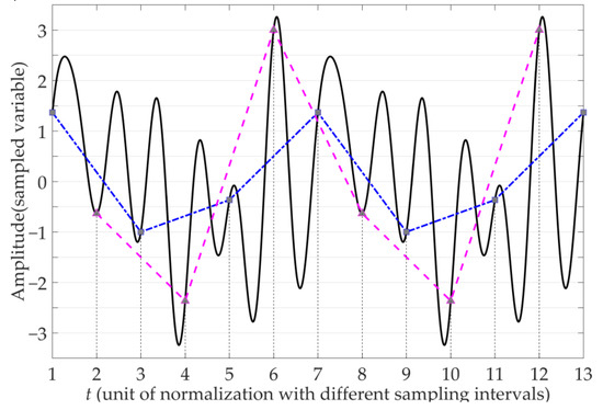 The whole -process -can be illustrated by the special example in Figure 2. In this graph, a sequence of period-6 was chosen as the object of analysis below. We set the embedding dimension m = 3 and the delay time τ = 2. It was assumed that the sequence is sampled from the first 13 data points onto the curve shown in Figure 2. In this case, the state space is divided into 3! (=6) parts, so there are 6 mutually different arrangement symbols. According to the definition in Equation (3), the first sample point has a three-dimensional (3D) coordinate of (1.3660,–1.0000,−0.3660). Following Equation (5), we found that x(i + τ) ≤ x(i + 2τ) ≤ x(i), i = 1. Then, the corresponding permutation is (−1.0000,−0.3660,1.3660) and the corresponding symbol sequence {120} is obtained by referring to Equation (6). Therefore, combined with Equation (3), the sequence (1.3660,−0.6340,−1.0000,−2.3660,−0.3660,3.0000,1.3660,−0.6340,−1.0000,−2.3660,−0.3660,3.0000,1.3660) can be converted into 9 symbol sequences for representation ({120}, {102}, {012}, {021}, {201}, {210}, {120}, {102}, {012}).