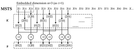 In traditional symbolic sequence analysis, the process of hierarchical symbolization is prone to excessive symbol in a certain layer, and the overlapping symbols indirectly lead to the loss of information. Permutation entropy [20,21] is a special symbol sequence method based on information entropy [22] and phase space reconstruction theory. It can effectively quantify the complexity of a time sequence. Permutation entropy does not need to stratify the amplitude of the time sequence, which is different from the general symbol sequence analysis method.