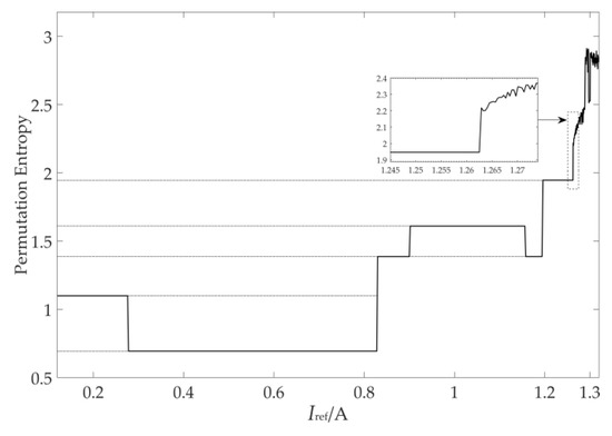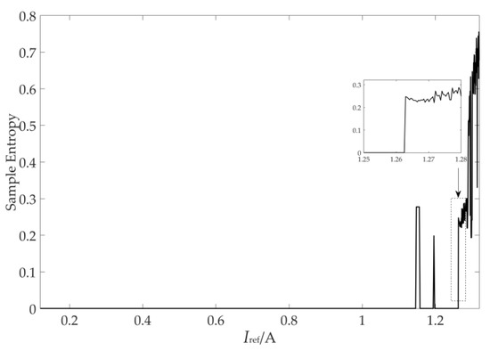 - When Iref ∈[0.8296,1.1946], the system works in period-2. We found that two bounder collisions of the system occur in this area because the inductance current of the system collides with the borderline of Ib2 and Ib1 at Iref = 0.9007 and Iref = 1.1578 A, respectively. Hence, the operating pattern of the converter system changes from F2F2 at Iref ∈[0.8296,0.9006] to F2F3 at Iref ∈[0.9007,1.1577] and to F1F3 at Iref ∈[1.1578,1.1946]. From the entropy value of three period-2 orbits shown in Figure 7, the permutation entropy value of period-2 is greater than the corresponding entropy value of any working pattern in the entirety of period-1. The sample entropy, used for assessing the complexity of the time sequence shown in Figure 9, is the negative logarithm of the probability of if two sets of simultaneous data points of length m have a distance smaller than r, then two sets of simultaneous data points of length m + 1 also have a distance smaller than r [28]. However, with the change in sample entropy, we could not find the bifurcation information of the system under period-1 and period-2 states.