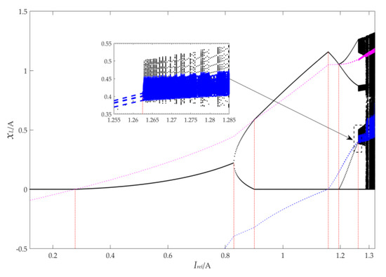 As shown in Figure 8, the inductor current xL is sampled at the operating mode interval and the bifurcation diagram of the system with Iref as a changing parameter can be obtained.