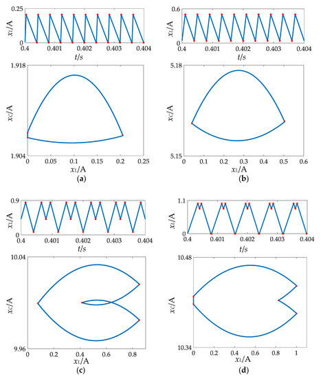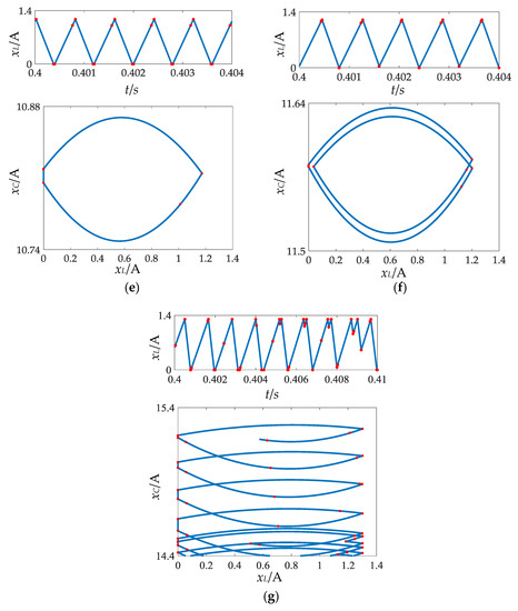 Moreover, the fourth border collision bifurcation occurs at Iref = 1.1947 A. Since the system has unstable characteristic roots at the same time, the system generates period-doubling bifurcation and enters the period-4 state. The working pattern is extended while F2 switches to F3.