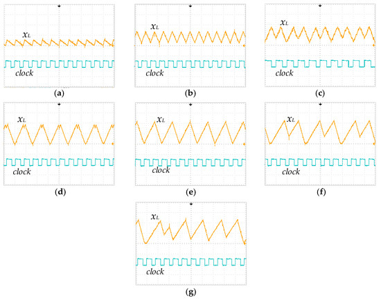 Experimental waveforms of inductor current xL and switching signal at (a) Iref = 0.20 A; (b) Iref = 0.50 A; (c) Iref = 0.85 A; (d) Iref = 1.00 A; (e) Iref = 1.17 A; (f) Iref = 1.20 A; and (g) Iref = 1.27 A.