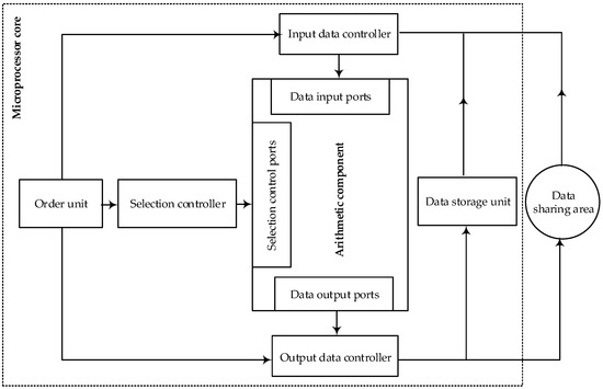 The FRTDS real-time solver consists of multiple microprocessor cores, which exchange data with each other through the data sharing area, as shown in Figure 1. There is a data transmission circuit, comparison operation circuit, and arithmetic operation circuit inside the arithmetic component. One order is extracted by the orders processing unit and is written into the selection controller, the input data controller, and the output data controller after being decomposed at each clock tick. The selection controller controls the operating state of the computing component, and the input data controller and the output data controller determine which data storage unit the input and output ports of the computing circuit are connected to.