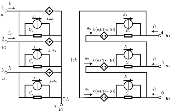 The transformer simulation model is a controlled source model [14]. The adjoint circuit model of the three-phase double-winding transformer with Y-d1 connection mode is shown in Figure 2.