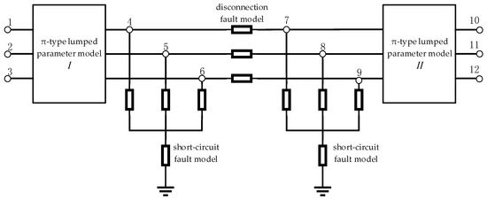 The transmission line simulation model is shown in Figure 3. One line is divided into two sub-lines. Every sub-line adopts the -type lumped parameter model, where two short-circuit fault models and one disconnection fault model are inserted. The disconnection fault model consists of three two-valued conductances. The short-circuit fault model consists of three two-valued conductances and one grounding conductance. By changing the state of the two-valued conductances and setting the value of the grounding conductance, the model can simulate different types of short-circuit faults. By changing the length of the two sub-lines, it is possible to simulate faults at different locations on the transmission line.
