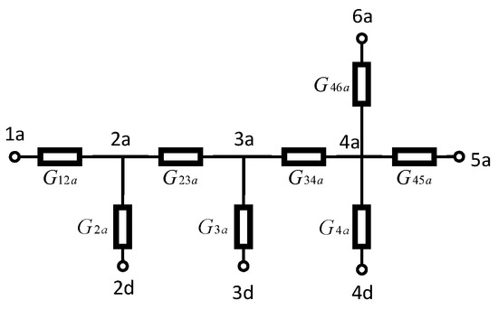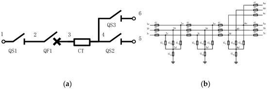 The interval unit usually consists of circuit breakers, isolating switches and current transformers. Figure 4a shows the interval unit of the incoming lines connected to the double-bus, and Figure 4b is its circuit. , and are the grounding conductances, , and are the equivalent conductances of the current transformer, while the rest are two-valued conductances. In order to set the value of the grounding conductance arbitrarily, the network is equivalented by setting nodes 1,5,6,2d,3d and 4d as boundary nodes. There are three independent sub-networks. Each sub-network contains only seven two-valued conductance before equivalence. The equivalent sub-network only has boundary nodes remaining, which reduces the dimension of the network equation and reduces the serial degree when solving the network equation.