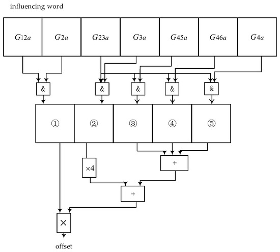 Because the sub-network is a purely resistive network, the internal equivalent is achieved by performing a star-angle transformation with the internal node being the central node one by one. If the path from the internal node to the equivalent admittance related node is turned on (each two-valued conductance on the path is equal to 108 S), the star-angle transformation affects the value of the equivalent admittance, which is determined by the value of the boundary conductance (the two-valued conductance between the internal node and the connected boundary node). Figure 5 shows the circuit of the A-phase sub-network before the internal equivalent. The equivalent admittance is taken as an example to illustrate the processing of the multi-valued parameter method. The paths 1a to 2d are numbered as ①, and the paths of the boundary nodes 3d, 4d, 5a, 6a to ① (2a) are respectively numbered as ②, ③, ④ and ⑤. The on/off status of path ① determines whether is zero or not. The remaining paths represent the effect of boundary conductance on the equivalent conductance in the star-angle transformation. The paths of star-angle transformation in the same time are classed into one group, then ② is classed into one group and ③, ④, and ⑤ are classed into another group. Conducted paths in the various groups are ordered according to their number and then combined to create a sequence. According to this sequence, the specific values of in each case are calculated and stored as multi-valued parameters in advance. has nine kinds of values. It is only necessary to count the number of conducted paths in each group to calculate the offset of . The decoding circuit is shown in Figure 6.