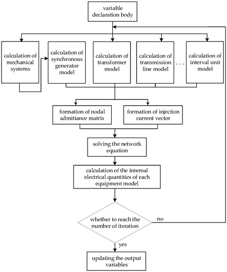 The power system simulation script framework is shown in Figure 7. It is mainly divided into six parts: (1) the variable declaration body; (2) expressions for forming the characteristic equations of each piece of equipment; (3) expressions for forming the network equation, which is composed of the expressions for forming the node admittance matrix and the injection current vector; (4) expressions for solving the network equation; (5) expressions for calculating the internal electrical quantities of each equipment model; (6) the expressions for updating the output variables, which are calculated by the node voltage and converted into the actual values to output.