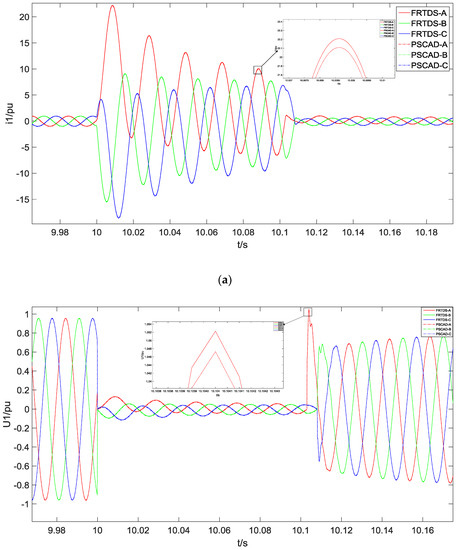 In order to verify the correctness of the simulation script, the simulation model with the same parameters is built on a power system computer aided design (PSCAD). In the operation mode that all of the buses are put into, a three-phase short-circuit fault command occurs at bus I at 10 s through the industrial control machine, and the fault is cleared after 0.1 s. Figure 9 shows the waveform of G1 terminal current, the voltage of bus 1 and the G1 speed, respectively, on FRTDS and PSCAD.