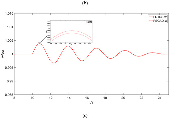 It can be seen from Figure 9 that the amplitude of the G1 terminal current increases sharply after the three-phase short-circuit fault occurs at 10 s. The voltage of bus 1 drops rapidly, and the exciter starts a strong excitation regulation to prevent the terminal voltage from dropping rapidly. As the electromagnetic power of the synchronous generator drops suddenly, the speed rises and oscillates under the regulation of the speed control system. After the fault is removed, the voltage of bus 1 is quickly restored to the rated value under the strong excitation regulation and the speed is gradually stabilized at the rated speed. The error between the waveforms of the FRTDS simulation and PSCAD simulation is less than 3%; thus, the simulation precision is high.