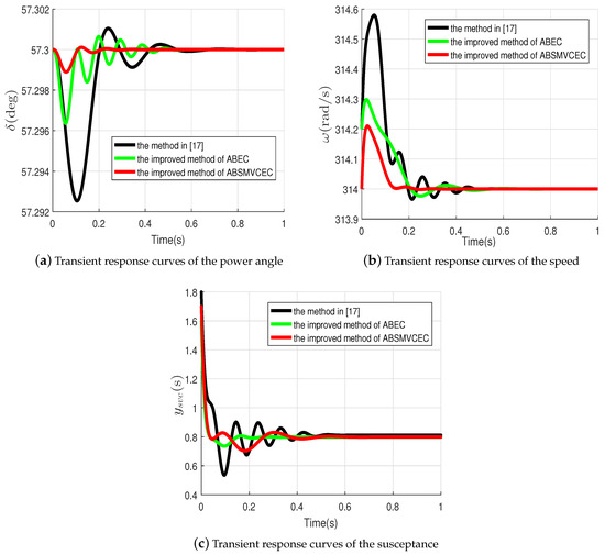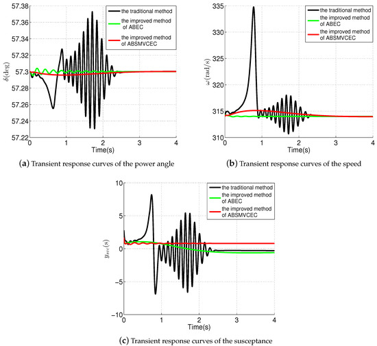 As shown in Figure 3c, the susceptance tends to 0.8, stabile basically. In addition, we can see the three methods all can get the system stable. It is obviously that the ABSMVCEC method has a faster convergence speed and brings a better steady state. Also, we can see from Figure 4c that the effect of the susceptance is also the same under large perturbations. When there is a large perturbation, the traditional method fluctuates greatly, but the improved method can resist the perturbation very well.
