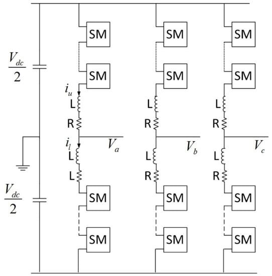Modular multilevel converters are coming solutions for providing high reliability, capability and good harmonic performance solution for power electronic converters [1,2]. MMCs are generally used in high-power applications such as grid-connected converters [3]. They consist of a high number of capacitors and power electronic switches. Accordingly, the MMC absorbs a small amount of active power to keep the capacitors’ DC voltage constant and compensate for power losses. However, a mismatch in conduction and the switching losses of power electronic switches, make the voltage of the capacitor unbalance. Balancing the voltages has been a major issue in the latest research [4,5,6,7]. Moreover, there have been investigations concerning the implementation of the advanced current controller for MMC. In Reference [8], a model predictive control strategy is proposed to regulate the AC side current, balance the capacitor voltages and control of circulating current concurrently using a single modified cost function. Another study in Reference [9] has proposed a design which controls the total energy and energy balancing between upper and lower arms. A method in Reference [10] for computing the circulating current reference by Lagrange-based multi-objective optimization has been introduced. This method is compared with the closed-loop methods and has proven better performance. In Reference [11], an algorithm for mitigation of circulating current is presented, in which shows that it is composed of negative sequence with double line frequency and DC component. Also, the hysteresis current control algorithms can be used to control MMC [12]. Recently in Reference [13], a novel control strategy has been proposed for MMC based on differential flatness theory, in which instantaneous active and reactive power values are considered as the flat outputs. To achieve this goal, a mathematical model of the MMC taking into account dynamics of the ac-side current and the dc-side voltage of the converter is derived in a d-q reference frame. Moreover, in Reference [14] presents a new function-based modulation control method for modular multilevel converters (MMCs). The main contribution of this study is the formulation of two new modulation functions for the required switching signals of the MMC’s upper and lower sub-modules, correspondingly. Furthermore, the stability analysis and control techniques for grid connected converter based on MMC is discussed in Reference [15]. In all above-mentioned literature, there is not a comprehensive model of MMC which could be considered for evaluation of MMC during unbalanced voltage conditions.