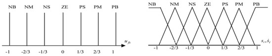 In fact, in the proposed current controller, there is a fuzzy controller for each symmetrical component of dq sequences that has two inputs () including one output (u). There are also seven linguistic variables, NB (Negative Big), NM (Negative Medium), NS (Negative Small), ZE (Zero), PS (Positive Small), PM (Positive Medium), PB (Positive Big), which are used as inputs and outputs respectively. Furthermore, to procure appropriate dynamic response, achieve a high level of accuracy and guarantee the stability of the whole system, a set of decision rules for the fuzzy controller is designed that is presented in Table 1. These rules contain the input/output relationships which they are mapped by membership functions to describe the control strategy. Both input and output membership functions are scaled into the range of −1 and 1 with an equal span as shown in Figure 3. In order to guarantee the robustness and stability of the controller, an adaptive procedure based on Lyapunov theory is implemented which is completely given in Reference [19,20].
