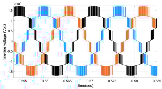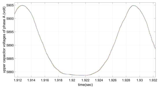 The reference values for the real power and reactive power are determined and implemented. The voltages of six capacitors of phase A are illustrated in Figure 4. As shown, they are around the nominal value of each SM capacitor initial voltage. The three-phase line to line voltages are given in Figure 5. Six levels of voltage are clearly seen as expected. It is obvious that the voltage levels vary within acceptable boundaries caused by charging and discharging of the capacitors.