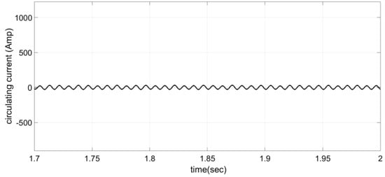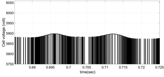 In Figure 6, the upper cell voltage of phase A is displayed. Because of 10 times switching of cell voltage in a cycle, the switching frequency of approximately 600 Hz is clearly observed for the power electronic switch. The dc current flowing which circulates through the arms and the dc side of the converter is illustrated in Figure 7. The DC current supports the power balance in the dc side’s capacitors.