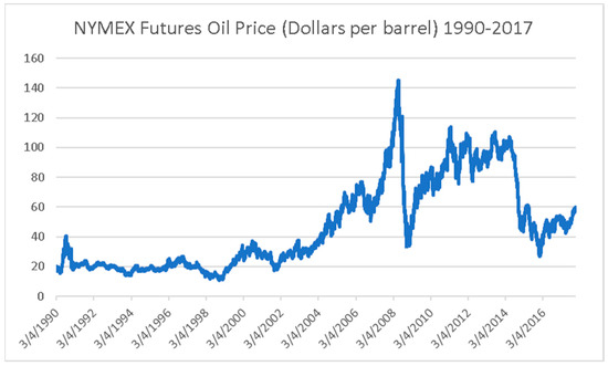 Figure 2 respectively. Our effort is to include data for full years, and as a matter of fact our data start from the first time NYMEX started offering standardized natural gas contracts with physical delivery at the Henry Hub up to 2017. We have chosen to use the prices of futures as futures’ markets tend to be more liquid and to include adjustments faster than the spot market. For the rest of the paper, NYMEX Crude Oil futures prices and NYMEX Henry Hub prices will be referred as oil and gas prices respectively for reasons of convenience.