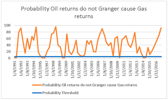 We then proceed with the Wald tests for the relationship from oil to gas, and we have a confirmation of the full sample result. ΔOilt does not Granger cause ΔGast for most of our rolling VARs. The null hypothesis of accepting no causality from oil to gas returns is persistent for almost the whole examined period.