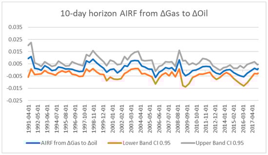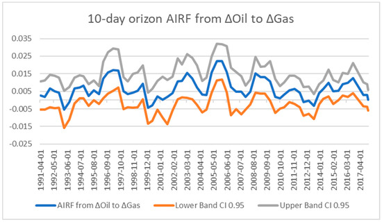 To elaborate the long-term impacts analysis, we consider two trading weeks—i.e., 10 days. This is due to the fact that we refer to highly liquid markets with intensive information absorption. We reach useful results when we calculated the 1% price shock of one commodity’s long term impact to the other’s price, where the accumulated long term impact that gas price changes have to oil is close to zero, as it surpasses the 0.005% level only three times and lasts for very short periods. On the contrary, 1% of oil price change causes positive gas price reactions between 0.01% and 0.02%.