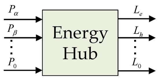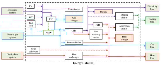 The district heating system, electricity system, natural gas system, plug-in hybrid electric vehicles (PHEVs) of future energy systems, and other various energy system forms are becoming tightly linked to each other in IES [5,6], in which the heat pump, diversified storage devices, combined cooling, heating and power (CCHP)/combined heating and power (CHP), power to gas (P2G), power to heating (P2H), absorption chiller, gas turbine, micro-gas turbine, gas furnace/boiler, etc., are all integrated. The energy coupling relationship is close and complex [2,6]. Energy hub (EH) is defined as an input–output port model that describes the energy, load, network switching, and coupling relationships in a multi-energy system [3,4,5]. As a new coupling method [2,4,5,6,7], EH can solve coupling problems between electric power systems, district heating systems, natural gas systems, etc. EH can play a role in mutual transformation, distribution, and storage of various types of energy, which is highly flexible. Besides, EH can adjust the output and operation states of different equipment according to different optimization objectives of the model, so as to meet the demand of corresponding loads [6,7].
