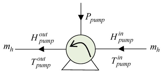 Figure 4 is a schematic diagram showing a water circulation pump, which can effectively compensate the pressure loss caused by a pipeline taking place in a district heating system. The circulating pump is usually installed at the heat source to generate and maintain the pressure difference between the supply water pipelines and the return water pipelines. However, the circulating pump is sometimes installed at some special return water pipelines to overcome the flow resistance, which meet the pressure demand of special nodes [25,27]. The power required by the circulation pump is related to the mass flow and the static pressure difference, which is given by: