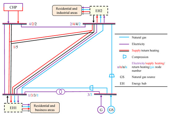 In this section, a typical winter day in north China is taken as an EH example, the energy users have typical heat, electricity, natural gas energy demands [31,32,33,34,35]. During a typical winter day, fuel cells, PHEV, solar collectors, electric chillers, and absorption chillers are not put into operation (as shown in the dotted line in Figure 2) due to insufficient sunlight intensity, extremely low demand for cold load, and the short working hours of PHEV or even no running state, etc. An IES-containing natural gas system, an electricity transmission system, district heating system, a CHP unit, a thermal generator unit, two EH units, and a natural gas source unit are presented, the structure diagram is shown in Figure 5, and the topology information of the IES case study is shown in Table 1.