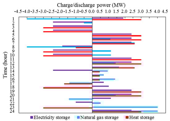 The change of battery, natural gas storage, and heat storage charge/discharge power in EH1 at a continuous time period are shown in Figure 6. During the valley price period (such as from 5:00 to 7:00), the battery is a state of charge, which can reduce the cost of electricity purchase, and also play a role in cutting peak demand (such as from 8:00 to 10:00 and from 17:00 to 18:00). However, the heat load demand is greater from 2:00 to 4:00, and heat storage, natural gas storage, and the battery are in a state of discharge so more electric energy and natural gas energy are converted to heat energy aiming to meet the heat demand peak, which reduces EH operation cost during the heat load peak period while the heat price is at the peak price. As a whole, battery, natural gas storage, and heat storage are in a state of charge from 11:00 to 16:00, meantime heat load, natural gas load, and electric load are experiencing valley demands.