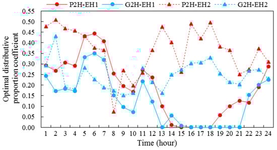 As shown in Figure 2, the power proportional coefficient of total natural gas bus energy flowing to the furnace/boiler unit in EH1 is denoted as G2H-EH1, and the power proportional coefficient of total electric bus energy flowing to the P2H unit is recorded as P2H-EH1, which has the same notation in EH2. A change in the optimal distributive proportion coefficient for EH1 and EH2 in IES is shown in Figure 7. First of all, the CHP unit in EH1 and EH2 are all in the shutdown states during the whole stable operation period according to the optimization results. This can be easily understood because the CHP unit usually has a gas turbine, an internal combustion engine, or a micro-combustion machine as its main component and their energy conversion efficiency is low because of more energy loss during the energy conversion process compared to the direct use of electricity, heat, and P2H and furnace/boiler units. The results shown in Figure 7 illustrate that the optimal allocation proportion coefficient of different EHs in stable and efficient operation can be obtained by the inner layer optimization strategy. During the period from 16:00 to 18:00, the furnace/boiler and P2H units in EH1 are in the shutdown state, and the heat distribution system provides all the heat energy to meet the demand of the heat load. It can be clearly seen from Figure 7 that the variation trend of the same type curve is significantly different.