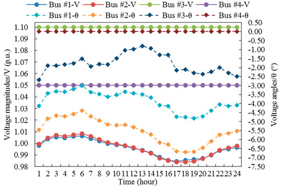 As shown in Figure 8, an electricity transmission system includes four nodes and four transmission lines, where Nodes 1 and 2 are PQ nodes, Node 3 is the PV node, and Node 4 is the slack node. Optimization results of nodes voltage magnitudes (V) and nodes voltage angles (θ) at a continuous time period are shown in Figure 8. The optimization results show that all nodes V are in the range of [0.9 p.u., 1.1 p.u.], and all nodes θ are in the range of [−8°, 0°].
