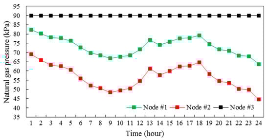 The natural gas pressure at all nodes is decreased compared to the reference gas source Node 3. Figure 9 shows the pressure gradient diagram from source Node 3 to the consumer/natural gas load (from Node 1 to Node 2) at a continuous time period. Minimum pressure of the natural gas node observed under steady state is the furthest consumer (Node 2) at a continuous time period. The pressure of node 1 fluctuates up and down at 75 kPa, while that of node 2 fluctuates up and down at 58 kPa, but more violently than that of Node 1. The pressure of each node is mainly influenced by integrated factors such as EH’s natural gas load demand, natural gas pipeline flow, and pipeline resistance.