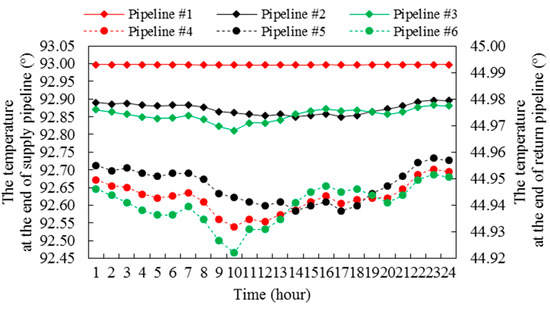 Due to the limited length, only the temperature at the end of supply/return pipeline that is connected to the supply pipeline from 1 to 3 and return pipeline from 4 to 6 in the district heating system is given. The calculation results of the supply and return pipeline’s temperatures at a continuous time period are shown in Figure 10. The results show that the temperatures at the end of the supply pipelines are approximately 92 °C, and the temperatures at end of return pipelines are approximately 44 °C. On the one hand, the temperature drop of pipelines is relatively small, and on the other hand, the temperature of heat load side is relatively stable, which can better meet the requirements of heat users.
