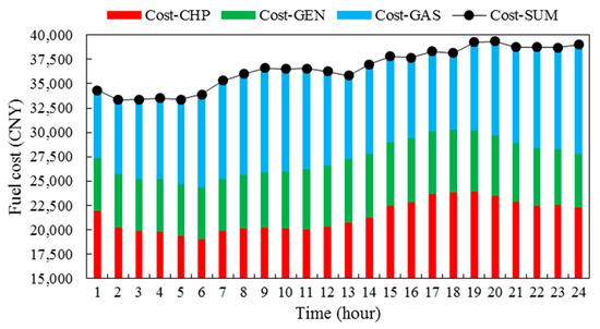 The optimization result of day-ahead optimal operating fuel cost is 877,653.58 CNY in the IES case, and the different types of fuel cost are shown in Figure 11 at a continuous time period. The change trend of various types of fuel costs per hour is noncorrespondence with the change trend of natural gas load, heat load, and electrical load demand. Since the CHP unit undertakes the main heating supply and part of the electricity supply, the CHP unit’s fuel cost (Cost-CHP) is nearly at maximum. The output of the thermal generating unit is relatively stable, and the fuel cost (Cost-GEN) is also relatively stable, which corresponds to the operation characteristics of the thermal generating unit. The price of heat and electricity is variable, while the price of natural gas is unchanged. From the results in Figure 11, it can be seen that natural gas plays a role of peak shaving and valley filling to a certain extent, so the fuel cost of natural gas (Cost-GAS) is relatively large.