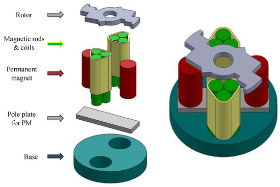 This motor was designed with a two-pole stator and two-pole rotor; two permanent magnets were placed on the stator. The diameter of the stator was 5.5 mm, its length was 4.4 mm, and the stator magnetic poles and permanent magnet utilized a cylindrical structure that facilitates the assembly of micro motors. As the magnetic rods utilized in the prototype design of this study are difficult to purchase, each stator pole was assembled using three magnetic rods made of nickel wire with a diameter of 0.75 mm. The permanent magnets were FLN8 AlNiCo magnets (Mingyen Electronics Industry Co., Ltd., Taichung, Taiwan). with axial magnetization. The rotor structure and pole plate utilized a 35CS300 silicon steel plate with a thickness of 0.35 mm. The design specifications of the single-phase switched reluctance motor are shown in Table 1; the exploded view and assembly drawings of the single-phase switched reluctance motor are shown in Figure 1.