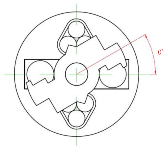 The design of the single-phase switched reluctance motor was critical because improper design often produces zero or negative torque and excessive torque ripple, limiting performance and applications. This study first determined the stator structure including magnetic rods, coils, and permanent magnets, and then considered rotor structure. The design of this motor was determined using JMAG finite element analysis software developed by JSOL Corporation, Tokyo, Japan. Figure 2 shows the definitions of the coordinate and rotating angle of the motor so that the axis of the permanent magnets was at 0°.