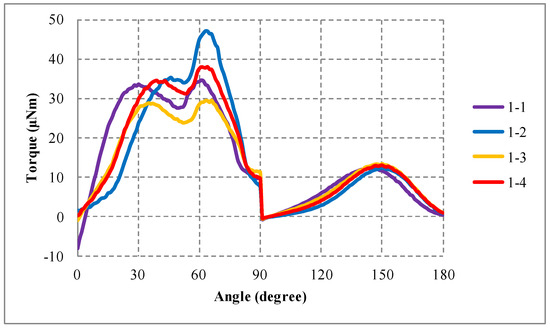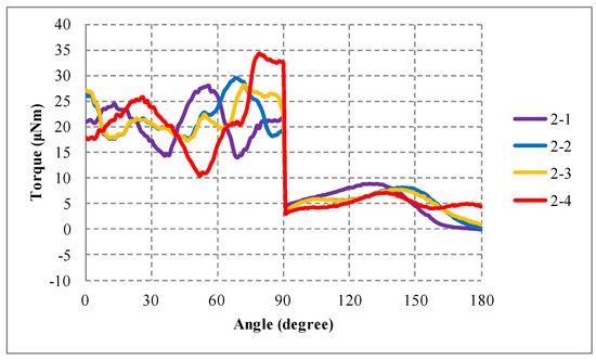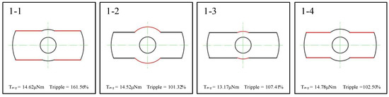 The first step of this study was to change the rotor magnetic pole width from 1.85 mm to 0.6 mm in decrements of 0.05 mm to achieve the optimal magnetic pole width of 1.6 mm. Next, the root diameter changed from 2.5 mm to 1.75 mm in decrements of 0.05 mm for an optimal root diameter of 2.0 mm. The design process is shown in Figure 3. In step 1-1, the rotor magnetic pole width was 1.85 mm and the root diameter was 2.5 mm; step 1-2 shows a rotor magnetic pole width of 1.6 mm and a root diameter of 2.5 mm, achieving the optimal magnetic pole width; step 1-3 shows a rotor magnetic pole width of 1.6 mm and a root diameter of 1.75 mm resulting in the worst average torque of 13.17 μN·m; step 1-4 shows that the rotor magnetic pole width was 1.6 mm and the root diameter was 2.0 mm for the best performance of step 1, with an average torque of 14.78 μN·m and relative torque ripple of 102.5%. The torque-angle curve of each process is shown in Figure 4, and a comparison of the torque characteristics is shown in Table 2.