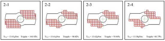 Step 2 was the axial symmetrical topology design of the rotor magnetic poles for quadrants 1 and 3. The mesh dimensions were 0.25 mm × 0.25 mm. We began by establishing five-layer meshes by adding two layers of meshes to the original magnetic pole width; the outer layer was defined as layer 1 and layer 5 was the closest to the X-axis. The design process was shown in Figure 5. In step 2-1, the first design decreased the average torque and relative torque ripple but still generated a dead zone between the angles of 160°and 180°; step 2-2 removed the meshes of the first and second layers to solve the dead zone issue; step 2-3 removed the meshes from the third layer for an evident decrease in relative torque ripple; step 2-4 removed more meshes from the first four layers to achieve the best performance in step 2,with an average torque of 13.38 μN·m and a relative torque ripple of 83.75%. The torque-angle curve of each process is shown in Figure 6, and a comparison of the torque characteristics is shown in Table 3. It should be noted that removing the meshes from the fifth layer did not improve output performance.