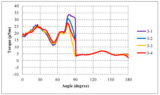 Step 3 was the axial symmetrical topology design of the rotor magnetic poles for quadrants 2 and 4. The mesh dimensions were 0.25 mm × 0.25 mm. We began by establishing three-layer meshes; the outer layer was defined as layer 1 and layer 3 was closest to the X-axis. The design process is shown in Figure 7. In step 3-1, the design increased the average torque and decreased the relative torque ripple; step 3-2 removed the meshes from the first and second layers for an evident decrease in the average torque and relative torque ripple; step 3-3 removed more meshes from the first and second layers without any improvement; step 3-4 removed one mesh from the third layer of the step 3-2 design without any improvement; step 3-2 was chosen as the best design for step 3, with an average torque of 13.10 μN·m and a relative torque ripple of 79.09%. The torque-angle curve of each process is shown in Figure 8, and a comparison of the torque characteristics is shown in Table 4. It should be noted that the design of the rotor magnetic poles in quadrants 2 and 4 had a limited effect in terms of improving output performance.