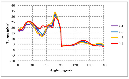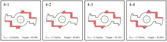 Step 4 was the detailed design of the rotor magnetic pole by shrinking the mesh dimensions to 0.125 mm × 0.125 mm. Since the degree to which adjustments to the rotor magnetic poles in quadrants 2 and 4 improved the performance was limited, this step only presents the analysis results for the rotor magnetic poles in quadrants 1 and 3. We began by establishing nine-layer meshes; the outer layer was defined as layer 1 and layer 9 was the closest to the X-axis. The design process is shown in Figure 9. In step 4-1, the design added meshes to the first and second layer without any improvement; step 4-2 removed meshes from the first layer for an evident increase in average torque and relative torque ripple; step 4-3 removed meshes from the third, fourth, and fifth layers without any improvement; step 4-4 used a diagonal design for the salient pole for an evident increase in average torque and relative torque ripple; step 4-4 was selected as the best design for step 4, with an average torque of 13.75 μN·m and a relative torque ripple of 82.85%.The torque-angle curve of each process is shown in Figure 10, and a comparison of the torque characteristics is shown in Table 5.