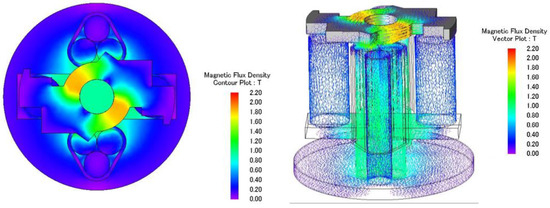 The electromagnetic analysis results for the single-phase switched reluctance motor design using the topology method are presented in top view and 3D view diagrams in Figure 11, Figure 12, Figure 13 and Figure 14. The motor was driven by an input current of 1 A at angles between 0° and 90°, and by a permanent magnet at angles between 90° and 180°. The magnetic flux density distribution for when the coils began to excite at an angle of 0° is shown in Figure 11. The maximum flux density of 1.86 T occurred in the rotor, while a density of 0.91 T occurred in the air gap. The magnetic flux density distribution when the motor produced the maximum torque at an angle of 74° is shown in Figure 12. The maximum flux density of 1.94 T occurred in the rotor, while a density of 0.63 T occurred in the air gap. The magnetic flux density distribution when the current was switched off at an angle of 91° is shown in Figure 13. The maximum flux density of 0.99 T occurred in the pole plate, while a density of 0.29 T occurred in the air gap. The magnetic flux density distribution when the permanent magnet produced the maximum torque at an angle of 135° is shown in Figure 14. The maximum flux density of 1.05 T occurred in the pole plate, while a density of 0.27 T occurred in the air gap.