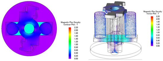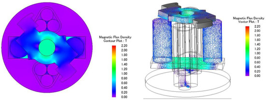 Since the maximum flux density of the rotor was larger than the 1.63 T from the manufacturer’s catalog, there was some concern regarding magnetic saturation, and this was confirmed later in the experiment. It should be noted that there was magnetic leakage at the bottom of the three magnetic rods, with this leakage being especially evident in Figure 13 and Figure 14, because the distance between the magnetic rods and the permanent magnets was too small. If three small magnetic rods are replaced by one large rod and the distance is increased, the problem will be solved; this was demonstrated in a simulation that is not shown here.