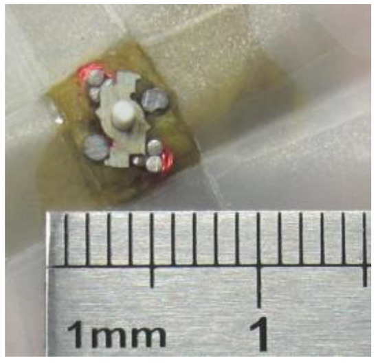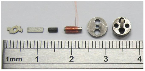 The parts of the single-phase switched reluctance motor were fabricated by mechanical machining processes and a prototype was hand-assembled. As shown in Figure 15, the components of the motor (from left to right) were the rotor, pole plate, permanent magnet, magnetic rod with coil, base, and fixture with fixed shaft. A top view of the motor prototype is shown in Figure 16. The rotor, pole plate, base, and fixture were made by wire electrical discharge machining. The magnetic rod used Goodfellow Cambridge Ltd. (Huntingdon, UK) NI005159 nickel wires that were cut and grinded before being wrapped around the coils. The permanent FLN8 AlNiCo magnet was produced by Mingyen Electronics Industry Co., Ltd. (Taichung, Taiwan). The assembly of the motor was carried out by first inserting the magnetic rod with coil into the base, placing the pole plate and permanent magnet on the base, and installing the fixture and fixed shaft. A copper wire with a diameter of 0.06 mm was wrapped around the fixed shaft to secure the axial air gap of the motor. The rotor was placed on the shaft to complete the assembly process.
