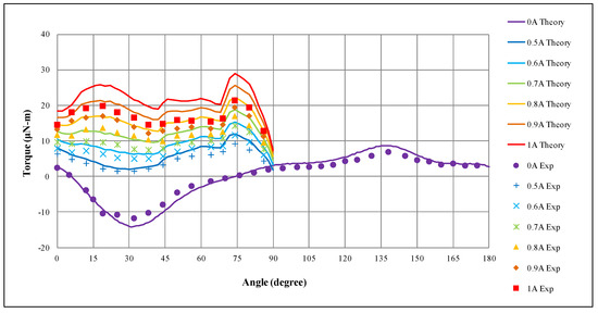 As friction greatly affects the performance of a micro motor, this test measures the friction torque by hanging tiny weights on the outer diameter of the rotor. For this test, the permanent magnets were removed and measurements were taken at every 3° interval between 0° and 360° to calculate the average friction torque, which was found to be 1.19 μN·m. In order to find the impact of the friction, it was assumed that the friction was entirely against the output torque. The study added the friction torque to the output torque, and the output characteristics were recalculated. Table 7 shows the calculated values of the maximum torque and average torque of the motor with and without friction correction. Figure 18 shows the theoretical and experimental torque–angle curves of the motor with friction correction. At a rated current of 1 A, the deviations between the theoretical and measured maximum torque and average torque were 26% and 16%, respectively. It should be noted that the deviation increased as the input current increased.