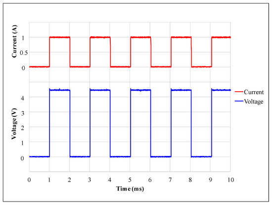 The speed of this motor was tested by a direct connection to the motor driver with a square wave current input, and the voltage and current signals of the coil were measured at various excitation frequencies. At a rated current of 1 A, the motor achieved a maximum rotation speed of 1500 rpm with an excitation frequency of 50 Hz. The voltage and current signals were 4.4 V and 1 A, as shown in Figure 19.